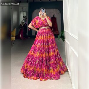 Floral Chiffon Co-ord Set with Pearl Touch Stitched Lehenga & Blouse – Floral Pink