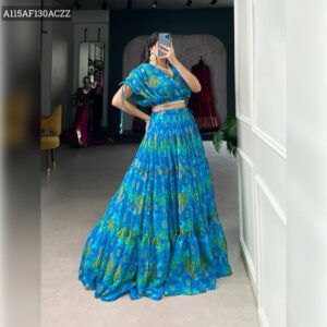 Floral Chiffon Co-ord Set with Pearl Touch Stitched Lehenga & Blouse – Floral Cyan Blue