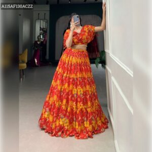 Floral Chiffon Co-ord Set with Pearl Touch Stitched Lehenga & Blouse – Floral Red