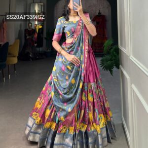 Festive Kalamkari Print Designer Lehenga Choli with Dupatta – Raspberry Pink & Slate Blue