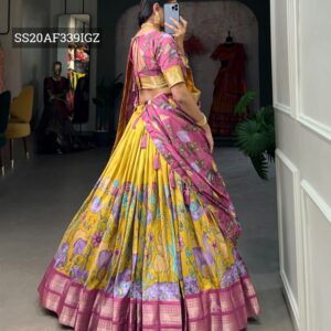 Festive Kalamkari Print Designer Lehenga Choli with Dupatta – Yellow & Pink