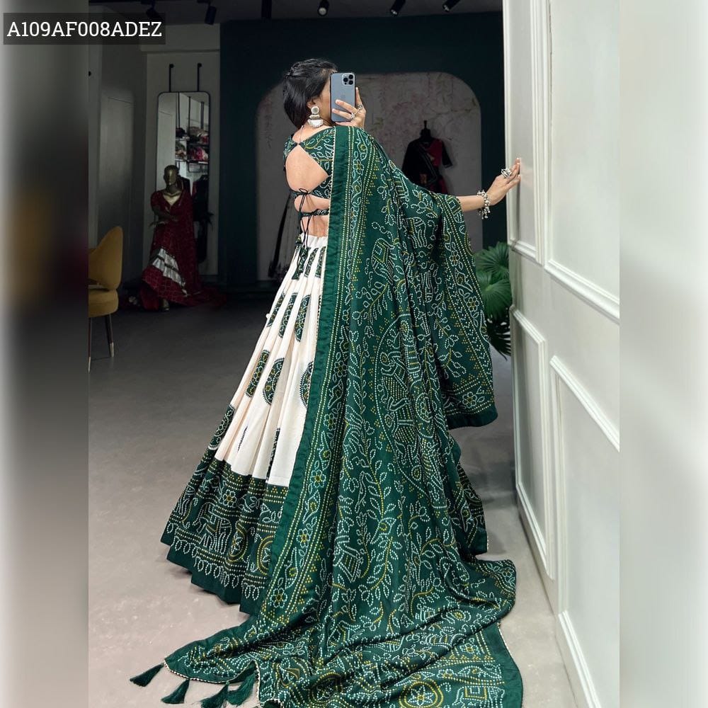 Tussar Green and White Lehenga Choli with Bandhej Print
